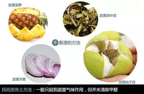 【4】民间土方法 民间传言果皮(橘子皮、柚子皮、菠萝皮、洋葱等)、茶叶水、食醋等可以除甲醛,那到底是真的吗? 首先,果皮除甲醛只是用浓郁的果香味来掩盖污染物的味道,并不能直接吸收或去除甲醛,污染的危害依然存在,反而更难被人发现,这跟用香水、空气清新剂之类的掩盖室内异味是一个道理。 其次,茶叶水、食醋却实能吸收一些甲醛,但其实起主要作用的不是醋,而是水。因为甲醛具有极高的亲水性,易溶于水,所以说实际放同量的水,吸收或清除的效果差不多。而一盆水与空气的接触面积只有盆口那么大,1克活性炭吸附的面积则可以达到一个足球场那么大,也就是说,一百盆水吸附的甲醛效果还不如一包小小的活性炭。 所以用食醋、茶叶水来吸附甲醛是不现实的,也是不科学的。日常生产中,之所以人们会认为食醋、茶叶水可以去除甲醛,则是因为它们挥发出来的气味将污染物的味道给掩盖了,这点跟果皮有点像。 所以,民间的这些土方法对除甲醛是没有什么功效的,当然,它们也有好处,比如柚子皮可以防虫除臭,醋可以预防感冒等流行传染病。