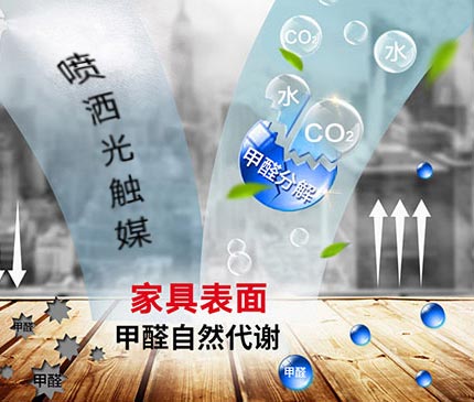 【11】光触媒除甲醛 光触媒是一种以纳米级二氧化钛为代表的具有光催化功能的光半导体材料的总称,通过高压喷枪将其涂布于基材表面,形成一层纳米筛网状保护层。光触媒在光的作用下发生光催化作用,产生活性氧和氢氧自由基,能够对室内空气中的甲醛、苯、TVOC等有害物质进行有效降解,生成无毒无害的二氧化碳和水。因此,光触媒能够有效降低室内甲醛的浓度,且很环保,不会产生二次污染。又因为其只作为催化剂,本身不参与反应而被消耗掉,所以只要保护层不被破坏,其除污能力会持续有效。所以,光触媒是目前市面上除甲醛比较环保,持久性比较强的一款产品,是现在很多新装修房除甲醛的较好选择。